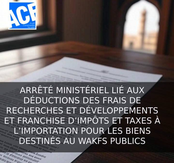 - ARRÊTÉ MINISTÉRIEL LIÉ AUX DÉDUCTIONS DES FRAIS DE RECHERCHES ET DÉVELOPPEMENTS ET FRANCHISE D’IMPÔTS ET TAXES À L’IMPORTATION POUR LES BIENS DESTINÉS AU WAKFS PUBLICS